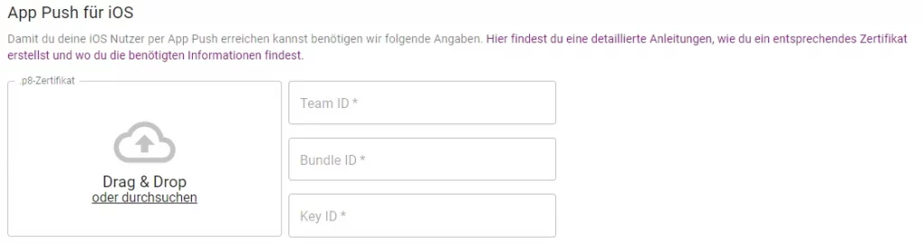 Um App Push in deine iOS App zu integrieren, lade zunächst das iOS SDK herunter. Zudem musst du in deinem Apple Developer Account ein .p8-Zertifikat erstellen sowie die Team ID, die Bundle ID und die Key ID. Hier zeigen wir dir Schritt für Schritt auf, wo du diese Informationen findest.