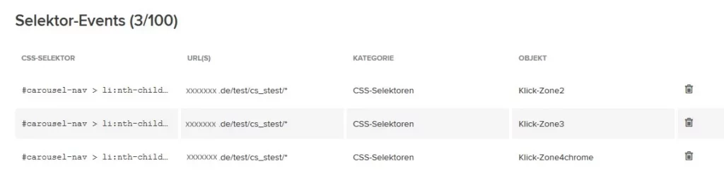 We recommend copying the desired selector directly from the source code of your website to avoid errors when transferring more complex selectors. - Enter one or more URLs. The URL determines on which web pages the clicks are measured. You can use wildcards here to specify multiple websites with one entry. Example: “https://www.domain.de/angebot/*” stands for all websites whose URL begins with “/offer/”.